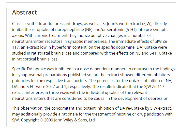 SJW has been reported to work for anhedonia/depression. Hyperforin in hypericum perforatum is a potent reuptake inhibitor of serotonin, dopamine, noradrenaline, GABA and glutamate. It also stimulates capillary blood flow. Hypericin is a weak MAOA and MAOB inhibitor at high levels (not possible to obtain through normal doses). Hypericin also has affinity for the σ1 receptor as an agonist. However, it is an antagonist at adenosine, benzodiazepine, GABAA and GABAB and inositol triphosphate.